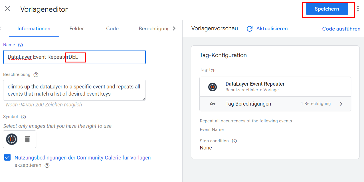 Damit ein Austausch eines Templates auf diesem Weg möglich ist, müssen beide installiert sein. In den meisten Fällen bedeutet dies, dass die vorhandene und auszutauschende Vorlage bearbeitet werden muss, damit sie einen anderen Namen trägt. Anderenfalls wird sich der Tag Manager weigern, die neue Vorlage zu installieren. Hier gezeigt am Beispiel des "DataLayer Event Repeater", der als lokale Vorlage existiert und nun mit der Vorlage aus der Gallery ersetzt werden soll.